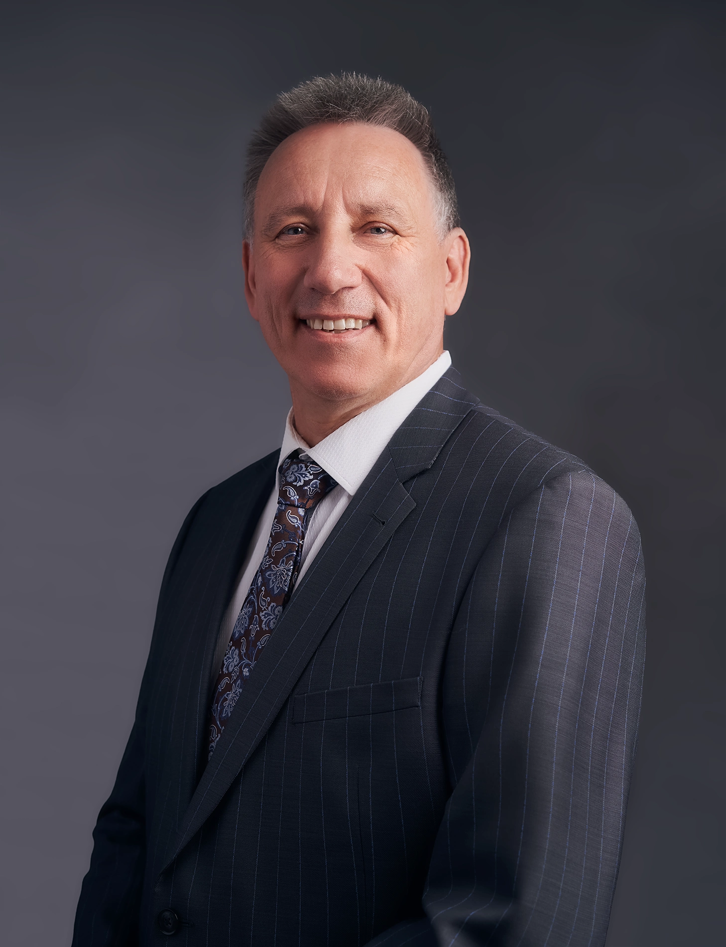 Professionelles Portrait eines Mannes im Anzug vor neutralem Studiohintergrund; er lächelt freundlich, trägt ein gestreiftes Jackett und eine gemusterte Krawatte, ideal für geschäftliche Präsentationen und Unternehmensdarstellungen.