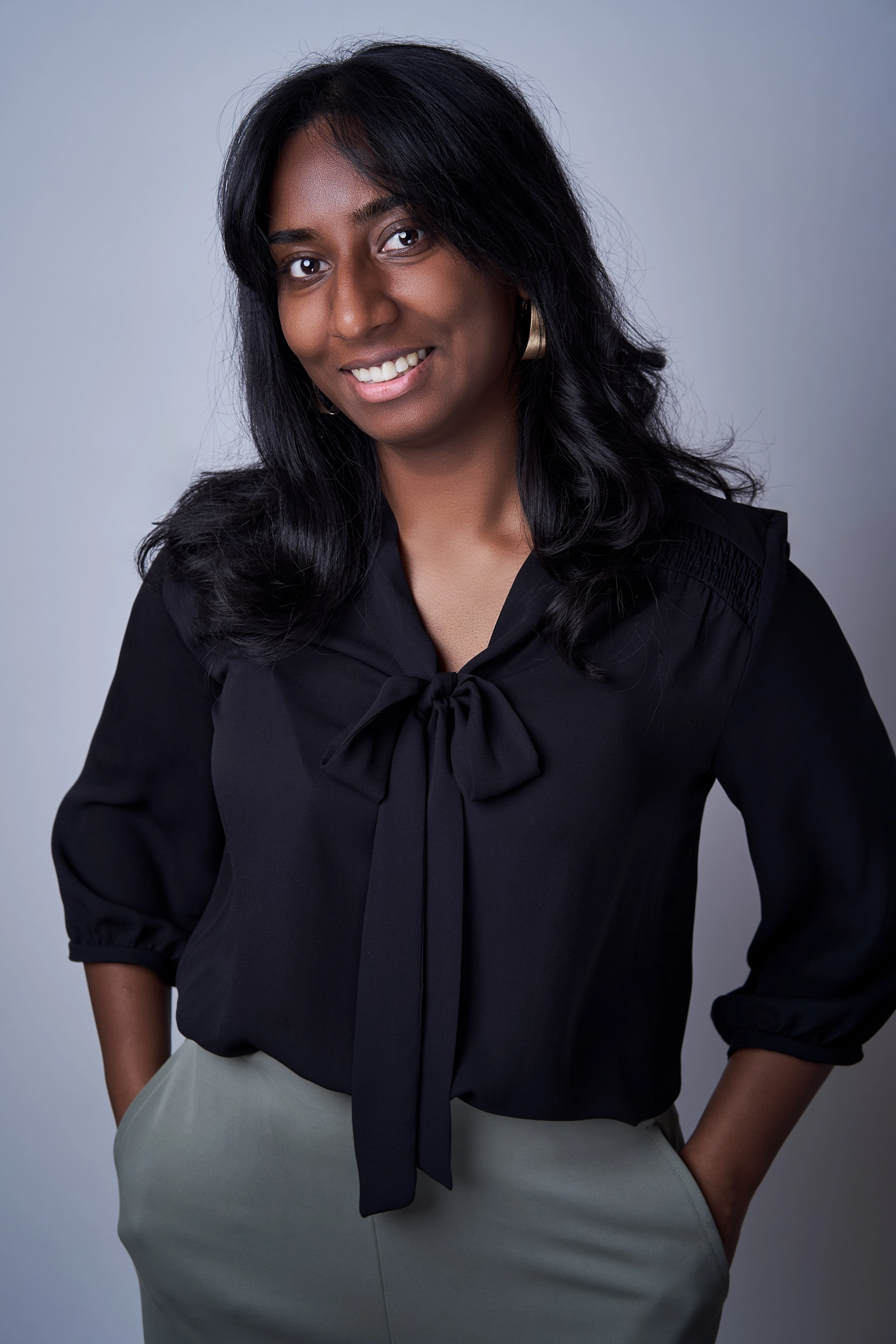 Platzhalter steht in einem hell ausgeleuchteten Studio vor einem weichen, grauen Hintergrund. Sie trägt eine elegante schwarze Bluse mit einer dekorativen Schleife am Kragen sowie hellgraue Hosen, in deren Taschen sie beide Hände locker gesteckt hat. Ihr schwarzes, schulterlanges Haar fällt weich und leicht gewellt nach vorn. Sie lächelt freundlich und wirkt offen, ruhig und professionell. Die Pose ist entspannt und selbstbewusst, wie in einem modernen Business-Portrait.